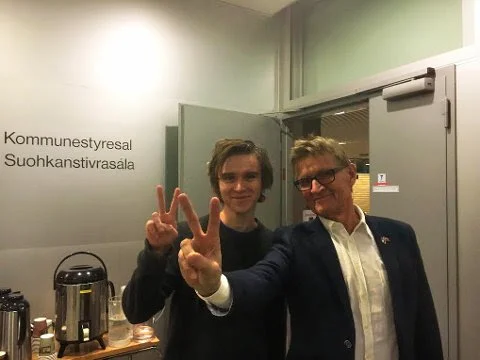 SEIER: Mads Gilbert og SVs Benjamin Notkevich var begge godt fornøyd med boikottvedtaket. – Jeg håper også flere kommuner tar opp denne viktige saken, sier Gilbert. (Foto: I nger Præsteng Thuen)