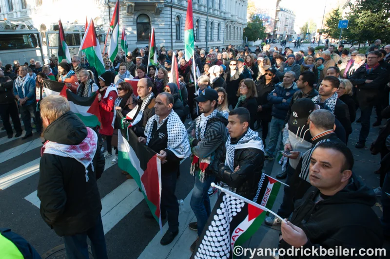 Ropene runget i Parkveien, 200 meter unna den israelske ambassaden. Foran massive politisperringer hadde Palestinakomiteen satt opp en scene hvor appellantene sa klart i fra hva de mente om den siste tids hendelser i Israel og på okkupert palestinsk land.