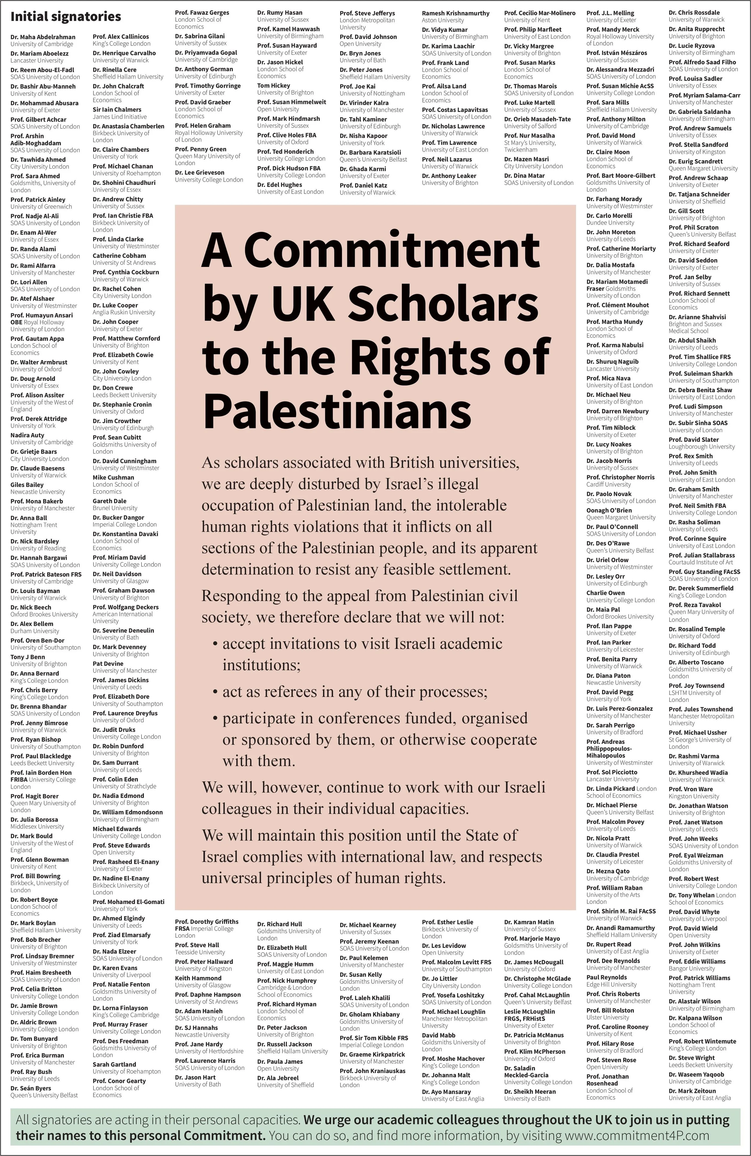 The declaration, by 343 professors and lecturers, is printed in a full-page advertisement carried in Tuesday’s Guardian, with the title: “A commitment by UK scholars to the rights of Palestinians.”